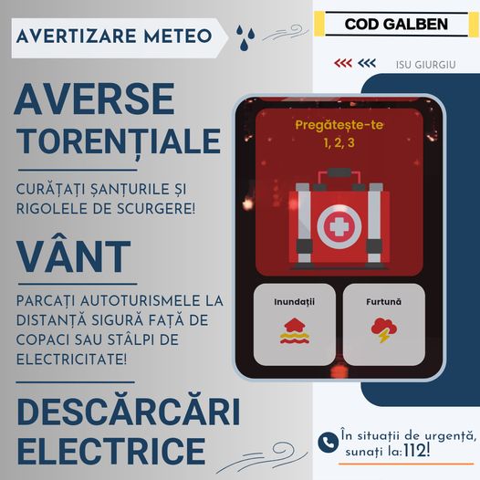 Județul Giurgiu se află sub o atenționare meteorologică de tip cod galben, valabilă până la ora 23:00. Conform prognozelor, în acest interval se așteaptă ploi torențiale, descărcări electrice și intensificări rapide ale vântului. Se estimează că precipitațiile vor atinge valori de 20-25 l/mp, cu posibilitatea ca în unele zone să depășească 40-50 l/mp. Din cauza cantității mari de apă prognozate, există riscul producerii de inundatii locale.