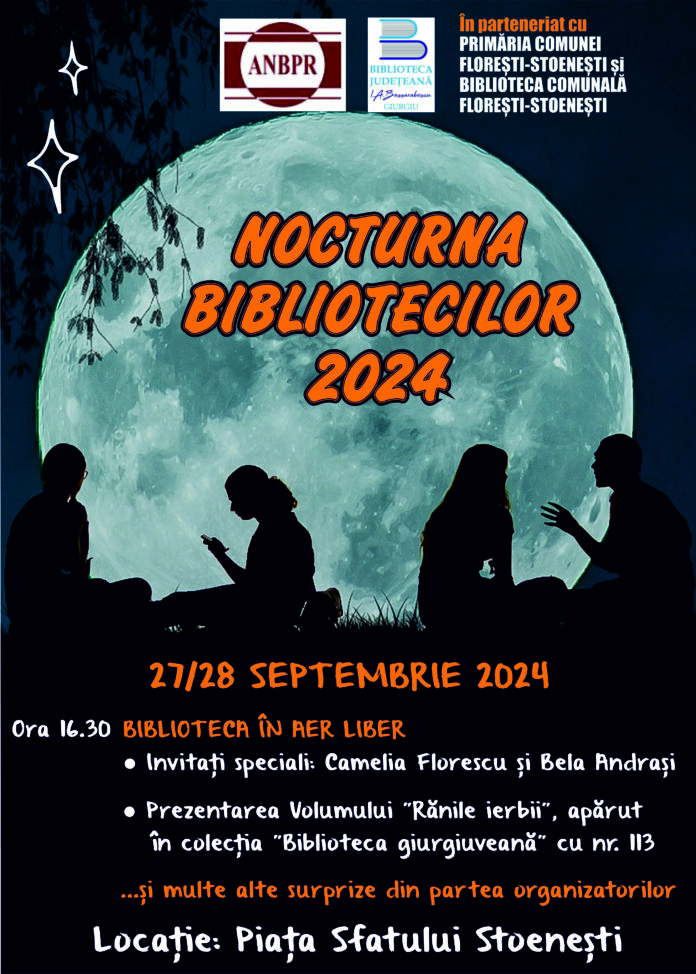 Primăria comunei Florești Stoenesti, împreună cu Biblioteca locală, va organiza un eveniment special intitulat "Nocturna Bibliotecilor - 2024". Acest eveniment este destinat tuturor pasionaților de carte și lectură, care apreciază cultura.