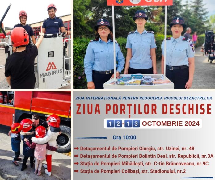 În acest weekend, pe 7 și 8 octombrie, subunitățile Inspectoratului pentru Situații de Urgență (ISU) din Giurgiu, Bolintin Deal, Mihăilești și Colibași vor organiza o zi deschisă pentru localnici. Evenimentul este o oportunitate pentru giurgiuveni de a înțelege mai bine activitatea pompierilor și de a observa cum sunt gestionate situațiile de urgență.