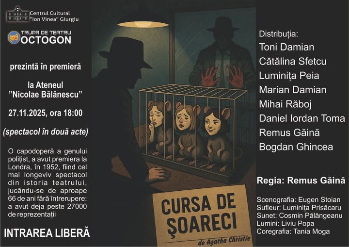 Trupa amatorilor de teatru Octogon, deja cunoscută publicului giurgiuvean, aduce în fața spectatorilor o nouă producție: „Cursa de șoareci” de Agatha Christie. Premiera este programată joi, 27 noiembrie 2025, de la ora 18:00, la Ateneul Nicolae Bălănescu.
