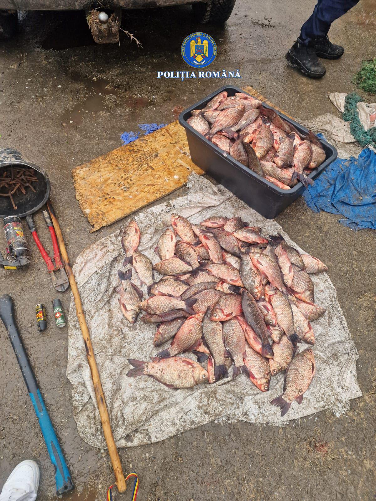 Polițiștii au observat un autoturism acoperit de noroi, aparent suprasolicitat, motiv pentru care au decis să-l oprească. Cu ocazia verificărilor, au găsit în interior o cantitate considerabilă de pește, totalizând 1.135 de kilograme, din specii precum sânger, novac, crap, caras, știucă și șalău.